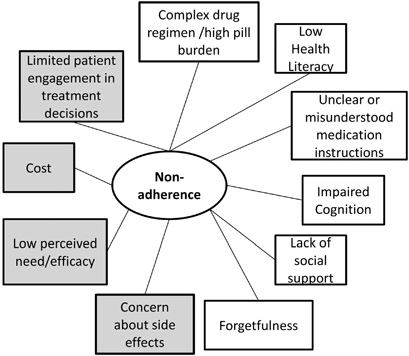 Adherence to medications is affected by many factors including side effects, cost, too many medications to take, and perception that the medication is unnecessary.